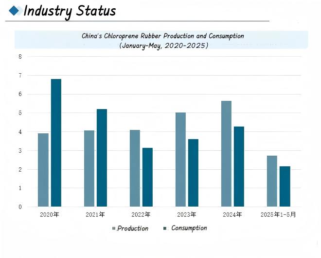 China is a major producer and consumer of chloroprene rubber. This industry has seen good growth because of rising demand from the car, construction, electronics, and medical device fields. From January to May 2025, China made 27,200 tons of chloroprene rubber, up 15.80% from last year. The consumption of this material reached 21,700 tons, which is a 30.67% increase compared to the previous year.