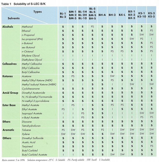 S-LEC B/K resins are quite soluble, dissolving in alcohols, esters, ketones, and aromatics, especially well in alcohols. Solubility differences among grades show variations in their chemical makeup.
